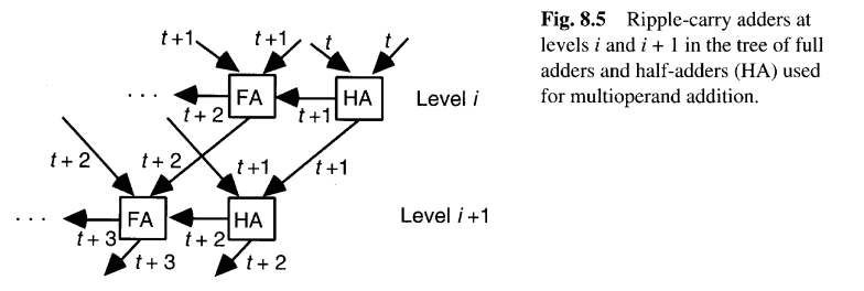 到目前为止,我们关于加法器延迟的讨论都基于一个默认的假设:所有输入数字一开始(或在时间0)就已全部就绪,并且所有输出数字都是在最坏情况的进位传播完成之后才被计算和取出的。另一种极端情况是,输入/输出数字串行到达和离开,这导致了非常简单的数字串行加法器设计。在这两种极端情况之间,存在着许多实际情况,其中输入数字的到达时间不同,或者某些输出数字必须比其他数字更早产生。