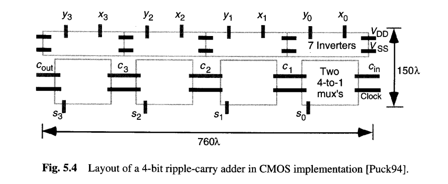 图5.3b所示的行波进位加法器直接导致了使用图5.2c全加器设计的CMOS传输门逻辑实现。图5.4描绘了一种可能的版图,该图还以λ(最小特征尺寸的一半)为单位显示了4bit行波进位加法器的大致面积需求。