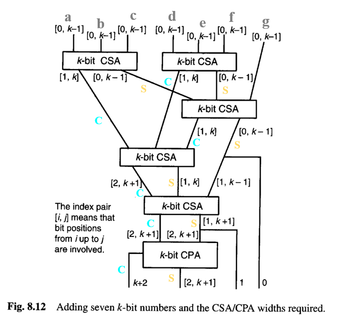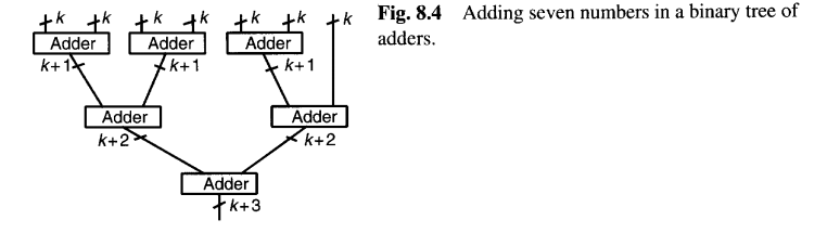 假设使用对数级延迟的快速加法器,图 8.2 方案对n个宽度为k的操作数求和的总延迟为: