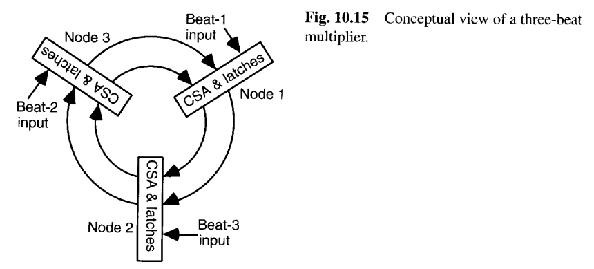 双节拍的概念可以轻松扩展以获得三节拍乘法器。通过将三个CSA和相关的锁存器放入一个环形中(图10.15),可以设想这样的设计,其节点由三相时钟驱动[deAn95]。每个节点需要两个节拍才能将其结果提供给下一个节点,从而导致奇数和偶数索引的部分积分别累积。最后,将四个操作数减少为两个操作数,然后将它们相加以获得最终乘积。