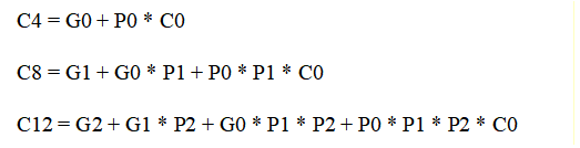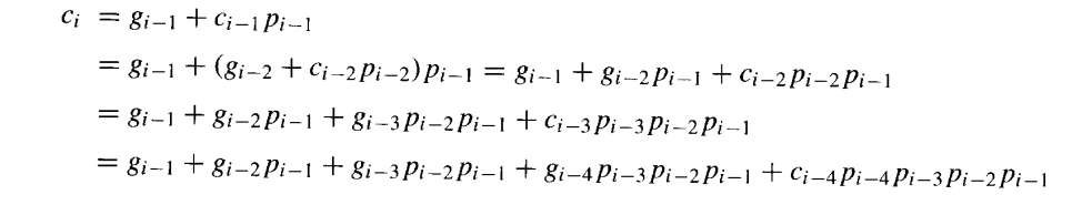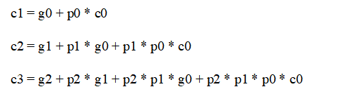 进位递推关系 ci+1=gi+pici表明,如果一个进位在第i阶段被生成 ,或者它进入第i阶段并被该阶段传播,那么它将进入第i+1阶段。人们可以轻松地展开这个递推关系,最终将每个进位ci表示为操作数位和cin的逻辑函数。以下是针对ci的三步展开过程: