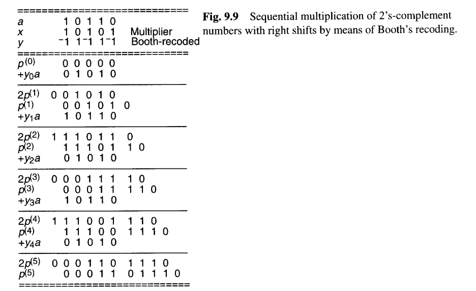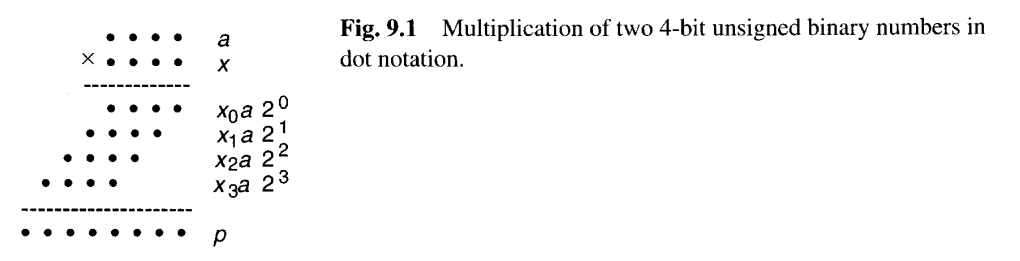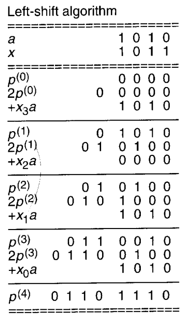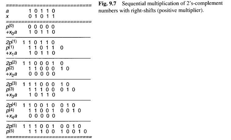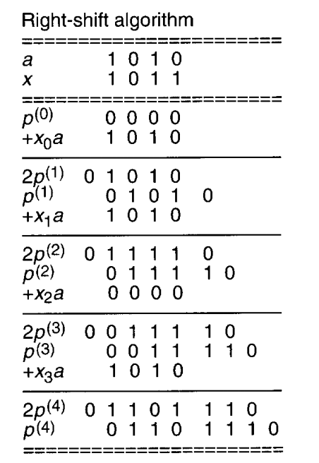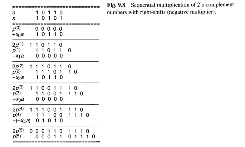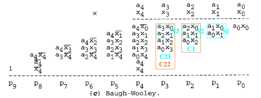 另一种证明Baugh-Wooley方法合理性的方式是将所有权重为负的a₄xᵢ项(0 ≤ i ≤ 3)移到底行,从而导致最后两行出现两个负数(即前面的数和由aᵢx₄位形成的数,0 ≤ i ≤ 3)。现在,需要从所有正元素的和中减去这两个数x₄和a₄x。我们不是减去x₄ × a,而是加上x₄乘以a的补码,即a的反码加上x₄(类似地对于a₄x)。读者应能补充其他细节。