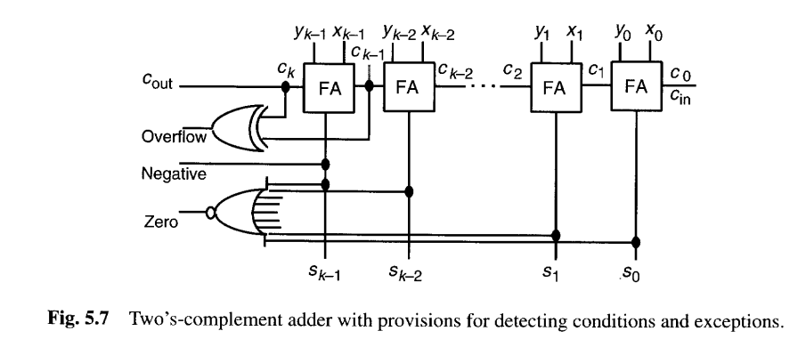 在二进制补码加法中,cout 没有(算术)意义。然而,由于一个加法器经常被用于同时处理无符号数和二进制补码数,因此**cout**仍然有用。图5.7显示了一个无符号或二进制补码加法器的行波进位实现,它带有用于条件和异常的辅助输出。由于测试"零"的或非门输入数量众多,它必须实现为一个或树后接一个反相器。