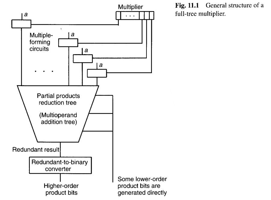 图11.1显示了一个全树乘法器的总体结构。与被乘数a相关的各个倍数,对应于乘数x的二进制或高基数位或其重编码版本,在顶部形成。倍数生成电路可以是一组与门(二进制乘法器)、基4 Booth的倍数生成器(重编码乘法器)等等。这些倍数在一个组合逻辑的部分积归约树中被相加,该树以冗余形式产生它们的和。最后,冗余结果在底部被转换为标准的二进制输出。
