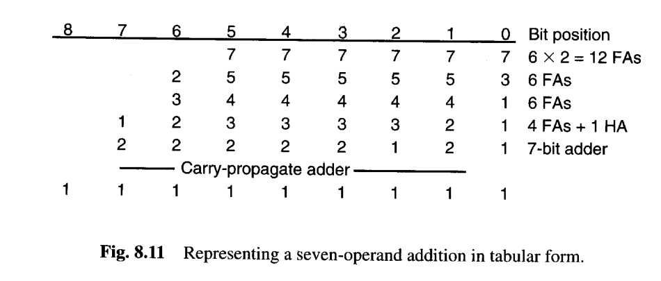 注意,第8章介绍的进位保留多操作数加法的结果几乎无需修改就适用于部分积归约树的设计。所需的唯一修改源于要相加的操作数的相对移位。例如,在图8.12中,我们看到在添加七个右对齐的k位操作数时,CSA都是k位宽。在一个7×7树乘法器的七操作数CSA树中,输入操作数以0到6位的移位出现,导致如图11.3顶部所示的输入配置。我们看到移位的输入需要在树的底部使用稍宽的块。比较图11.3和图8.12,注意所有差异,是有启发性的。(部分积归约本质上是多操作数加法问题,但操作数存在移位(对应乘法中的权重)。因此,CSA树的设计需考虑位宽扩展和不对齐的情况,导致树底部的加法器位宽更大)