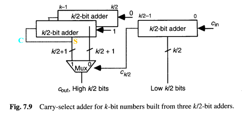 请注意,在前面的分析中,假设使用了三个完整的 k/2 位加法器。对于某些加法器类型,图7.9左侧的两个 k/2 位加法器可以共享部分硬件,从而获得更高的成本效益。例如,如果所用的组件加法器是超前进位类型,则计算 c{k/2} = 0 和 c{k/2} = 1 时和比特的两个加法器之间可以共享大部分进位网络。