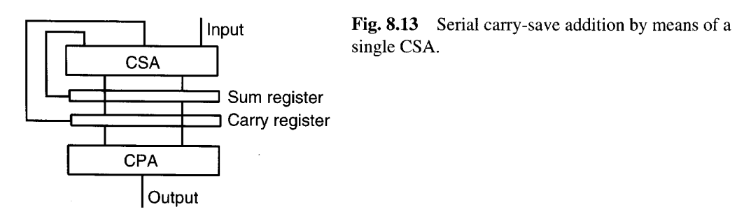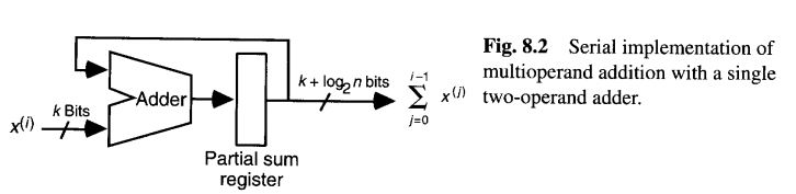 图 8.2 展示了使用单个双操作数加法器实现多操作数加法的串行解决方案。二进制操作数x(i)(i=0,1,...,n−1)每个时钟周期输入一个到加法器的某一端,另一端则接收来自部分和寄存器的反馈值。由于最终的和最大可达 n(2^k−1),部分和寄存器的宽度必须为log2(n2^k−n+1)≈k+log2n 位。