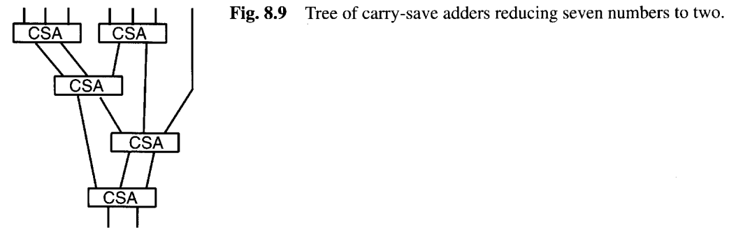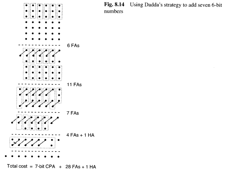 回顾第8.3节讨论的构建CSA树的Wallace和Dadda策略,这分别产生了Wallace和Dadda树乘法器。本质上,Wallace构建CSA树的策略是尽早组合部分积位,而Dadda的方法是尽可能晚地组合,同时保持CSA树的关键路径长度不变。Wallace的方法导致可能的最快设计,而Dadda的策略通常导致更简单的CSA树和更宽的进位传播加法器。