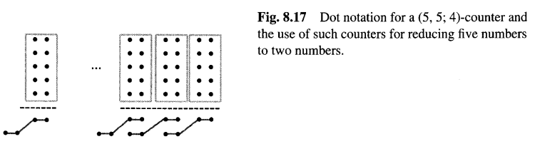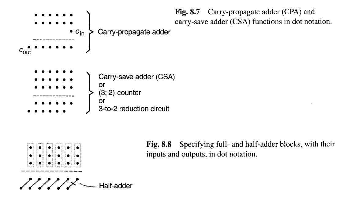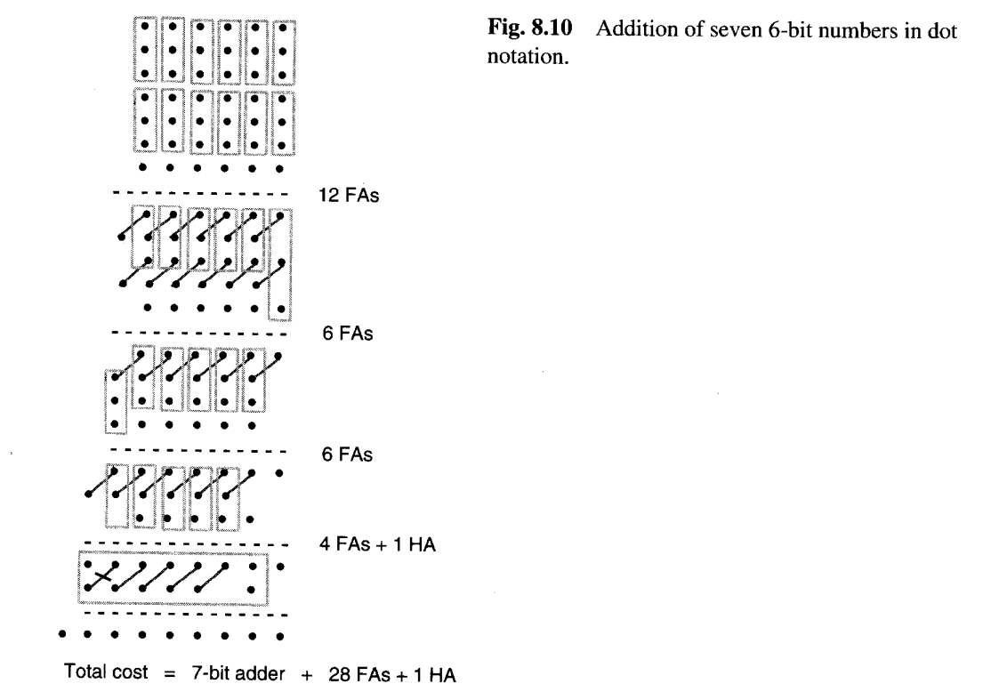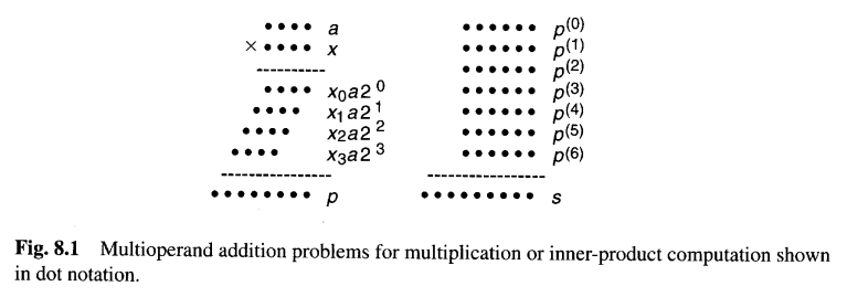 图 8.1 采用了"点表示法",这种方法在仅关注比特位置或对齐方式(而非具体数值)时非常有用。我们假设n个操作数均为宽度k的无符号整数,并按最低有效位对齐,如图 8.1 右侧所示。对有符号操作数的扩展方法将在 8.6 节讨论,而乘法应用则是第三部分的主题。