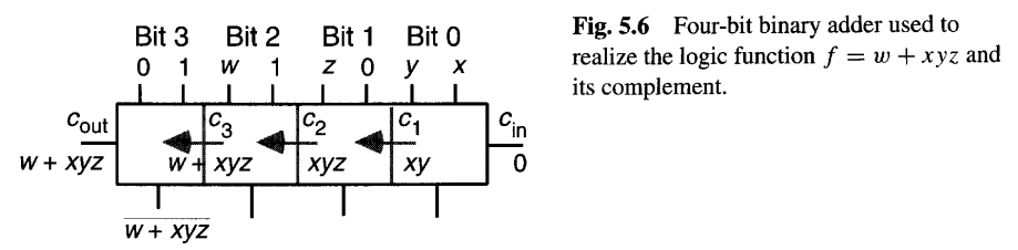 全加器和半加器以及多比特二进制加法器是强大的构建块,如果需要,也可用于实现非算术功能。例如,一个具有cin、两个4比特操作数输入、cout 和一个4比特和输出的4比特二进制加法器可用于合成四变量逻辑函数w+xyz及其补码,如图5.6所示。图5.6中写在箭头旁边的逻辑表达式表示各级之间的进位。但请注意,4比特加法器无需实现为行波进位加法器,输出端的结果仍然有效。