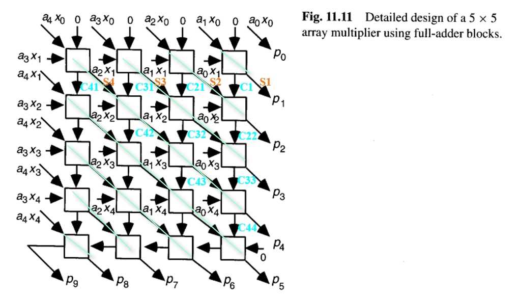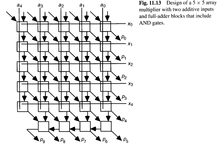 如果我们构建一个包含全加器和与门的单元来内部形成项 aj * xi,图11.11的无符号阵列乘法器就变成了图11.13。这里,xi 和 aj 比特被广播到单元的行和列 ,第 i 行、第 j 列的单元形成项 aj * xi 并将其用作其FA的输入。如果需要,可以通过用与门替换第一行或前两行中的单元来降低设计复杂度。