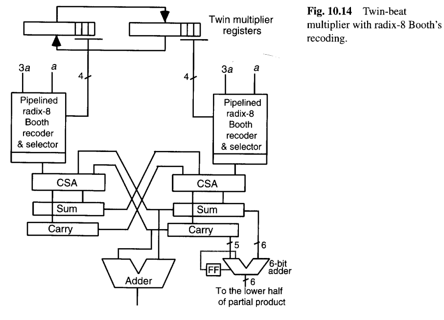 图10.14展示了一个一次处理3位的双节拍乘法器的示意图,它有效地在每个时钟周期内完成乘数的6位。这个使用基8布斯重编码的乘法器,类似于曼彻斯特大学MU5计算机中使用的双节拍设计[Gos171]。