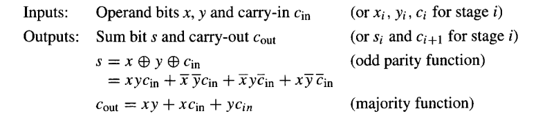 在接下来的三章中,我们将研究加速两个操作数(第6、7章)和多个操作数(第8章)加法过程的方法。对于两个操作数,快速加法的关键在于一个低延迟的进位网络,因为一旦知道进入位置i的进位,和位si就可以通过模加法从操作数位xi、yi和输入的进位ci在常数时间内确定: