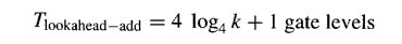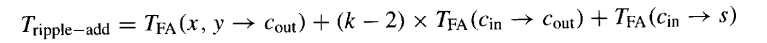 其中 TFA(input→output)TFA(input→output) 表示全加器在其指定输入和输出之间路径上的延迟。作为上述的近似,我们可以说行波进位加法器的延迟是kTFA。可以看到延迟随k线性增长,这使得行波进位设计对于高k或高性能算术单元来说是不可取的。请注意,比特串行加法器的延迟也是O(k),尽管由于锁存和时钟开销,这里的比例常数更大。