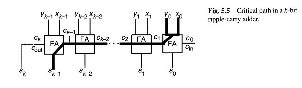 k比特行波进位加法器的延迟 可以通过考虑最坏情况信号传播路径来推导。如图5.5所示,关键路径通常从x0 或y0输入开始,沿着进位传播链行进到最左边的FA,并在sk−1输出处结束。当然,对于某些FA实现,关键路径可能从c0开始和/或在ck结束。然而,考虑到从进位输入到进位输出的延迟比从x到进位输出或从进位输入到s的延迟更重要,全加器设计通常最小化从进位输入到进位输出的延迟,使得图5.5所示的路径成为具有最大延迟的路径。因此,我们可以为k 比特行波进位加法器的延迟写出以下表达式: