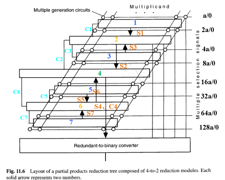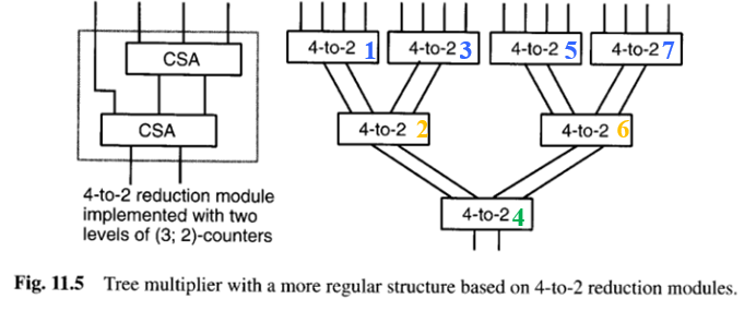 如果4到2归约模块内部由两级CSA组成,如图11.5所示,那么二叉树结构中的CSA级数可能比Wallace树或Dadda树更多。然而,互连的规则性以及由此产生的高效布局,可以充分补偿由于电路深度增加而带来的额外逻辑延迟。