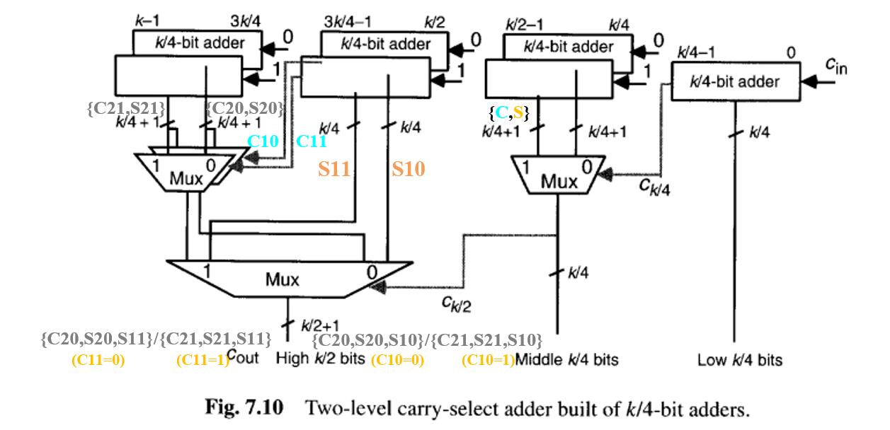 图7.10描绘了如何将进位选择思想更进一步,以获得一个两级进位选择加法器 。对于每个 k/4 位块(最右边的块除外),都在两种场景下计算其和与进位输出比特。三个第一级多路复用器(每个宽度为 k/4 + 1 比特)将 k/4 位块的结果合并为 k/2 位块的结果。请注意,跨越比特位置 k/2 到 3k/4 - 1 的加法器的进位输出信号,是如何用于在 c{k/2} = 0 或 c{k/2} = 1 两种场景下选择和的最重要的 k/4 位比特的。在此阶段,最终和的 k/2 个比特是已知的。第二级多路复用器(宽度为 k/2 + 1 比特)用于为和的高 k/2 位(位置 k/2 到 k-1)以及加法器的进位输出选择合适的值。