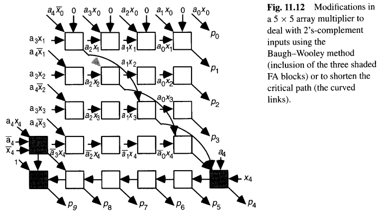 图11.11展示了使用全加器单元和两输入与门设计的 5×5 阵列乘法器。和输出对角连接 ,进位输出垂直连接 (最后一行除外,在那里它们从右到左链接)。图11.11的设计假设是无符号数,但使用Baugh-Wooley方法可以轻松转换为二进制补码阵列乘法器。这需要在行波进位加法器的右端增加一个全加器来处理 a4 和 x4 项,并在左下边缘增加几个全加器来容纳 ā4、x̄4 和 1 项(见图11.12)。图11.12中FA模块之间的大部分连接已被移除以避免杂乱。