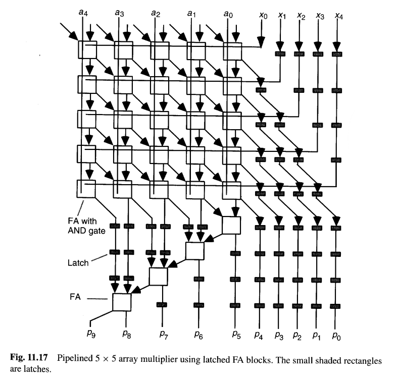 图11.17展示了对阵列乘法器进行流水线化的一种方法。输入从上方施加,乘积在九个时钟周期(一般情况为2k−1个周期)后从下方输出。这里使用的FA块假定其和与进位输出端都带有锁存器。请注意,阵列乘法器各层所需的xi输入是如何通过在路径中插入锁存器来延迟的,以及图11.13底部那个4位行波进位加法器在图11.17中是如何被流水线化的。