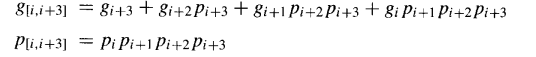 上述方程可以按照与展开进位方程相同的方式来解释:这四个比特位共同传播一个输入进位 ci,当且仅当这四个位置中的每一个都传播;它们共同生成一个进位,如果在位置 i+3 产生了一个进位,或者它在位置 i+2 产生并被位置 i+3 传播,等等。