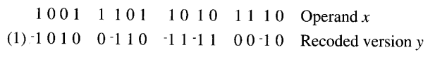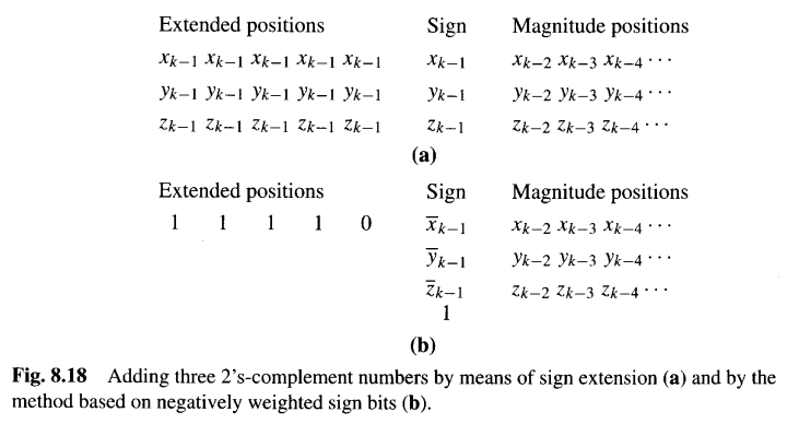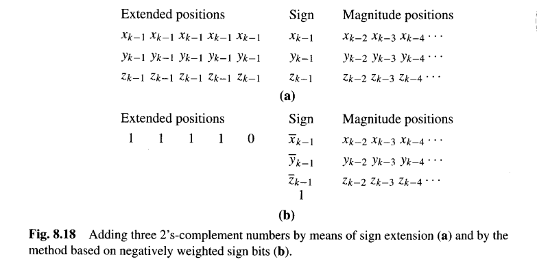 当直接进行2的补码乘法时,每个待加的部分积都是有符号数。因此,为了使CSA树能正确输出其输入的和,每个部分积都必须符号扩展到最终乘积的位宽。回顾我们在第8.6节中关于有符号多操作数加法的讨论,其中假设2的补码操作数的最低有效位(LSB)对齐。特别地,参考图8.18中基于符号扩展(硬件共享)和将负位转换为正位的两种可能方法。