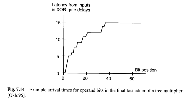 例如,我们稍后会看到,在将两个二进制数相乘时,部分积被归约为两个二进制数,然后这两个数在一个快速的双操作数加法器中相加以产生最终乘积。考虑到从原始输入到各个位的逻辑路径深度不同,这两个数的各个位会在不同时间就绪。图7.14显示了这种最终快速加法器的各个比特位上输入到达时间的一个典型例子。这些信息可以用于优化加法器的设计[Okl96]。