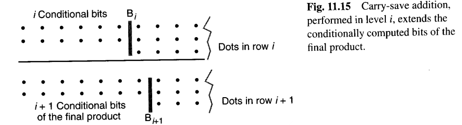 乘积的最低有效位直接输出,而其他位则通过一行行的全加器和半加器(图11.14中的矩形框)逐步归约。让我们关注第i级,并假设前i−1级已经产生了超过Bi边界的最终乘积位的两个版本:一个版本假设下一次进位保留加法将产生一个跨越Bi的进位,另一个版本则假设没有进位(图11.15)。