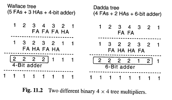 作为一个简单的例子,我们推导4×4乘法的Wallace和Dadda树乘法器。图11.2以表格形式展示了设计过程和结果,其中的整数表示各列中剩余的点数。每个设计以16个与门开始,形成xiaj项或点,0≤i, j≤3。得到的16个点分布在七个列中,模式为1, 2, 3, 4, 3, 2, 1。Wallace树设计在第一级需要3个全加器(FA)和1个半加器(HA),然后在第二级需要2个FA和2个HA,最后是一个4位进位传播加法器。对于Dadda树设计,我们的首要目标是将部分积点阵的高度从4降低到3 ,因此第一级需要2个FA。随后是第二级的2个FA和2个HA**(将高度从3降低到2)**,最后是一个6位进位传播加法器。