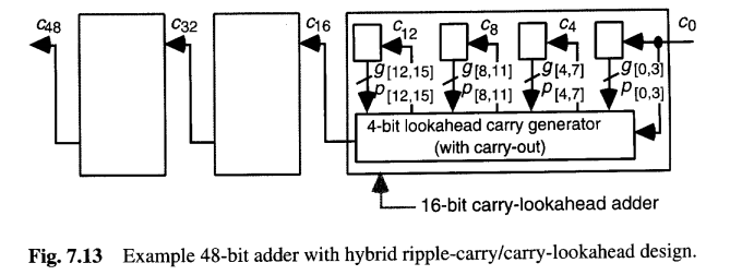 另一个有趣的混合设计是行波进位/超前进位加法器,其一个例子如图7.13所示。这种混合设计比纯超前进位方案稍慢,但其简单性和更高的模块化可能弥补这一缺点。这种混合设计相对于纯行波进位和超前进位加法器的成本和延迟分析留作练习,反向的超前进位/行波进位混合组合的开发和分析也同样留作练习。