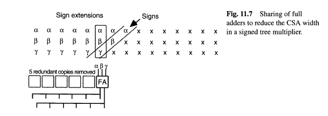 对于2的补码部分积的加法,考虑是类似的,唯一的区别在于移位。图11.7描绘了一个包含三个符号扩展部分积的例子。我们看到,这里同样可以用一个全加器产生多个不同列所需的结果。如果将此过程应用于部分积位矩阵的所有行,所得的结构将比假设操作数为无符号时稍微复杂一些。注意,由于移位,图11.7中的重复次数比图8.18少,因此为容纳符号而进行的宽度扩展会略大一些。