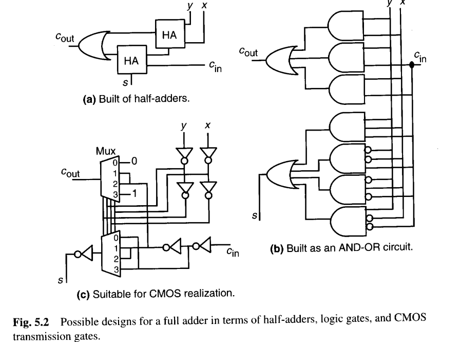 如图5.2a所示,一个全加器可以用两个半加器和一个或门来实现。如果两个HA是带有互补进位输出的与非门半加器,则图5.2a中的或门可以用一个与非门替代。或者,可以根据前述s和cout的逻辑方程,将全加器实现为两级与或/与非-与非电路(图5.2b)。由于全加器作为算术构建块的重要性,针对各种实现技术存在许多优化的FA设计。图5.2c显示了一个由七个反相器和两个4选1多路复用器构成的全加器,适用于CMOS传输门逻辑实现。