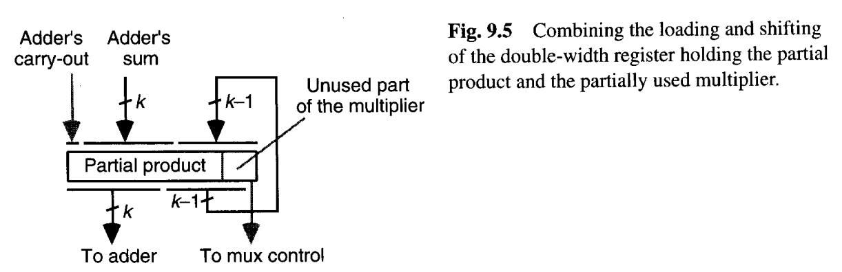 由于下一批h个操作数将相对于当前批移位h位,因此在每次处理后,可以释放(确定) 计算出的和中的h位以及进位中的h−1位。这些位使用一个h位加法器相结合,产生h位的最终乘积,进位输出保存在一个触发器中,以便与下一次的输入结合。或者,可以通过简单地在各自的寄存器中将这些释放的位右移,并将转换为标准二进制格式的操作推迟到最后,从而将它们保持在进位保留形式中。这就是为什么图11.9中的部分内容以虚线形式呈现。如果由于其他原因,ALU中已经有一个快速的双倍位宽加法器,则可以采用后一种方法。