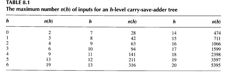 现在,如果我们不是将树输出反馈到其输入端,而是像图11.16所示那样,将其反馈到(h+2)输入树的中间,那么流水线的速率将仅由两个CSA(进位保存加法器)级的延迟决定,而不是整个树的深度。这带来了更快的乘法运算。