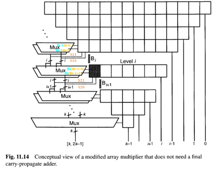 在第i级,图11.14中的阴影块 会根据未来跨越Bi+1边界是否有进位,产生其和与进位的两个版本 (条件版本)。来自阴影块的条件和比特被简单地附加到来自上方的i个比特之后 。这样,我们就获得了乘积的高i+1位的两个版本,其条件取决于未来跨越Bi+1边界的进位。然后,这个过程在更低的级别中重复,每一级都将条件计算部分的长度扩展一位,最终的多路复用器以非冗余形式提供最终乘积的最后k位。