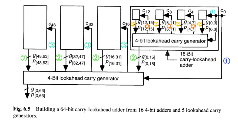因此,16位加法器的总延迟为9个门级 ,这比16位行波进位加法器所需的32个门级要好得多。类似地,要构建一个三级的64位超前进位加法器,我们可以使用四个上述的16位加法器外加一个4位超前进位生成器,如图6.5所示连接。**每增加一级超前进位,延迟将增加四个门级:其中两个门级用于产生和传播信号(g和p)的向下传递(自下而上),另外两个门级用于进位通过额外层级向上传播(自顶向下)。**因此,基于4位超前进位模块的k位超前进位加法器的延迟为: