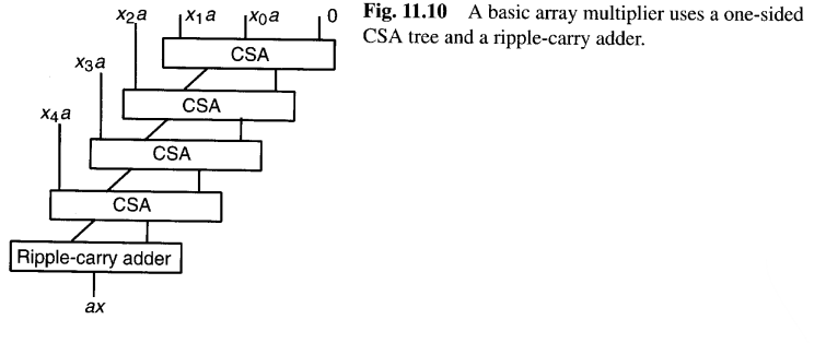 图11.10阵列乘法器中最顶部CSA的空闲输入端可用于实现一个产生 p = ax + y 的乘加模块。这在涉及卷积或内积计算的各种应用中很有用。当只需要计算 ax 时,可以移除图11.10阵列乘法器中最顶部的CSA,将 x0*a 和 x1*a 直接输入到第二个CSA。