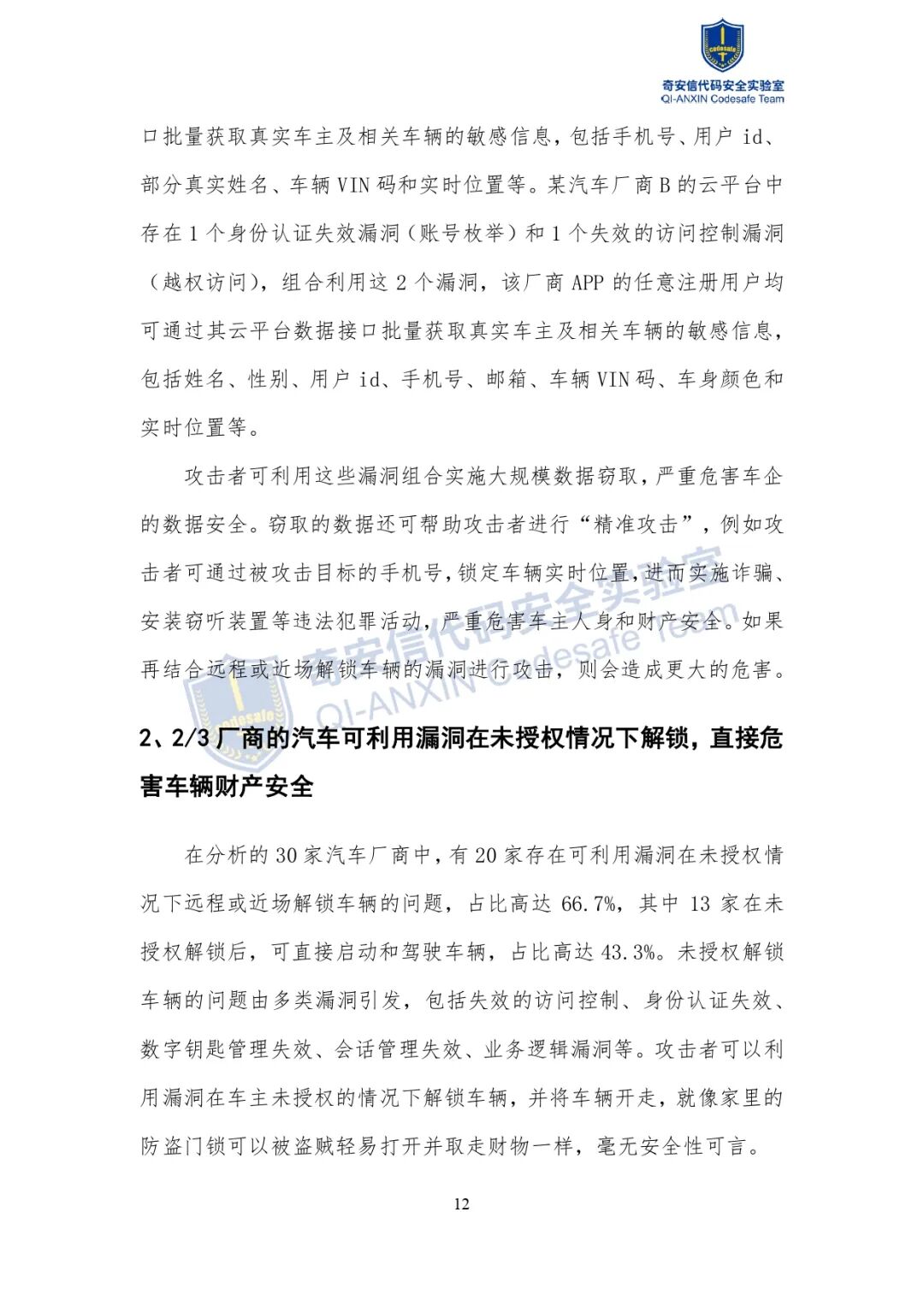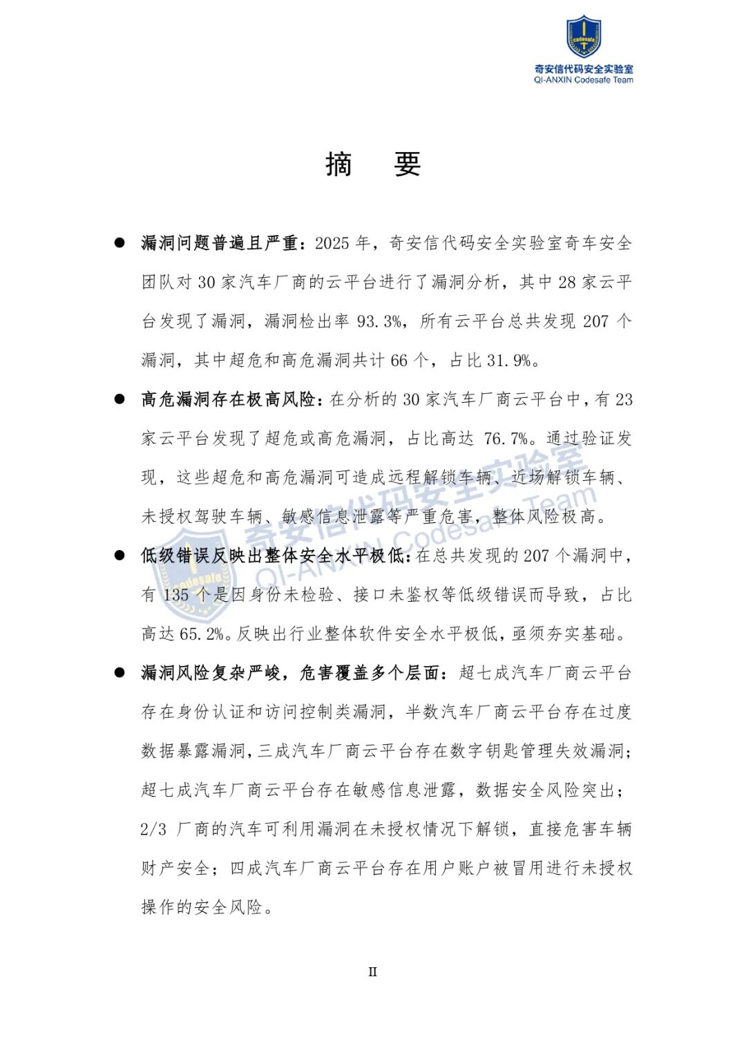 近日,奇安信代码安全实验室奇车安全团队发布《智能网联汽车云平台漏洞分析报告》(以下简称:《报告》)。报告对2025年度国内30家主流汽车厂商的云平台进行了漏洞分析,结果触目惊心:93.3%的厂商云平台存在安全漏洞,其中76.7%的厂商云平台存在超 危或高危级别漏洞,直接危害车企和用户数据安全、车辆安全,整体安全风险极高。从漏洞类型、成因、危害及影响范围来看,当前行业整体软件安全水平极低,安全防护基础极为薄弱,安全态势严峻,亟需引起行业的高度重视。