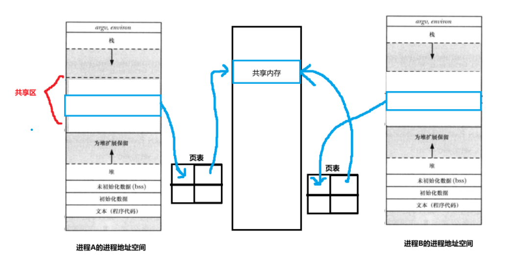 共享内存的原理就是在内存中申请一段空间,并通过虚拟地址将这块空间映射到两个进程的进程地址空间中的共享区,通过访问这段空间就能实现进程间通信。如下