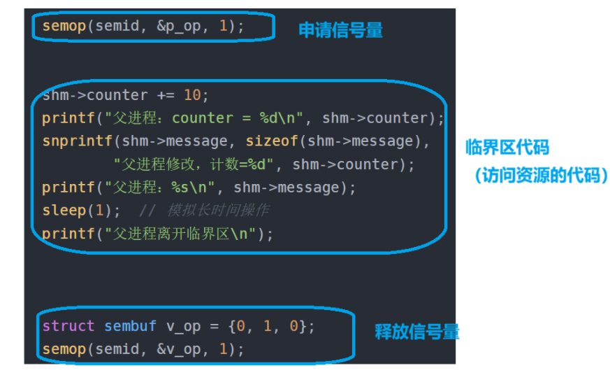 为了防止不同的进程访问到同一块区域,进程访问前就需要申请信号量(被称为P操作),看是否还有闲置的资源,如果没有就进入阻塞状态进行等待。申请信号量的本质就是对资源的预订。进程访问结束后,则需要释放信号量(V操作)。如果信号量只有0与1两个状态,即该资源同一时间只能由一个进程使用,则称其为二元信号量,其实就是互斥。由于信号量需要被多个进程访问,因此信号量本身也是一个共享资源,但操作系统内核会对其进行保护,不需要我们操心。