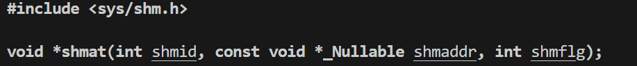 前面提到使用共享内存时需要将共享内存映射到程序的地址空间内,这个操作也需要我们调用函数来执行。使用shmat函数即可将共享内存挂接到程序地址空间中,第一个参数shmid就是共享内存的id,第二个参数是要挂接的目标虚拟地址,这个设置为nullptr让操作系统自己选即可,第三个参数用于处理读写权限,暂时不用管,设置为0使用默认设置即可。挂接失败会返回-1,成功会返回共享内存在程序地址空间中的起始虚拟地址,这个返回值其实与malloc的没有什么区别,使用方式是相同的。强制类型转换成任意一种指针然后当数组使用即可。