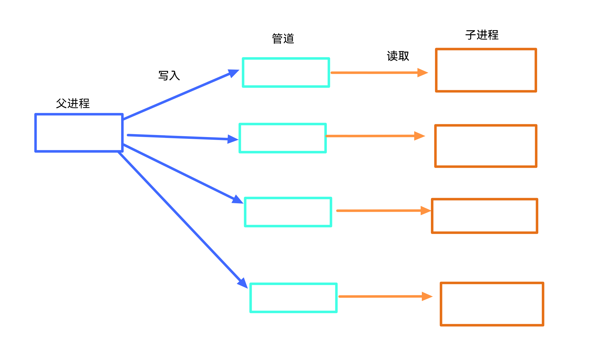根据匿名管道的同步机制,我们可以在父进程中创建多个管道,与多个子进程进行通信,父进程对管道进行写入,子进程则读取,当父进程没有写入时,子进程就会进入阻塞状态等待父进程写入。这样就能实现父进程向管道写入一次,子进程就运行一次。在此基础上,规定父进程每次只向管道中写入一个4字节的整形,子进程每次只将管道中的4个字节的内容当整形读取,根据整形的值执行不同的任务,就能实现父进程指挥子进程工作,这个整形被称为任务码,这个结构则被称为进程池。如下图。