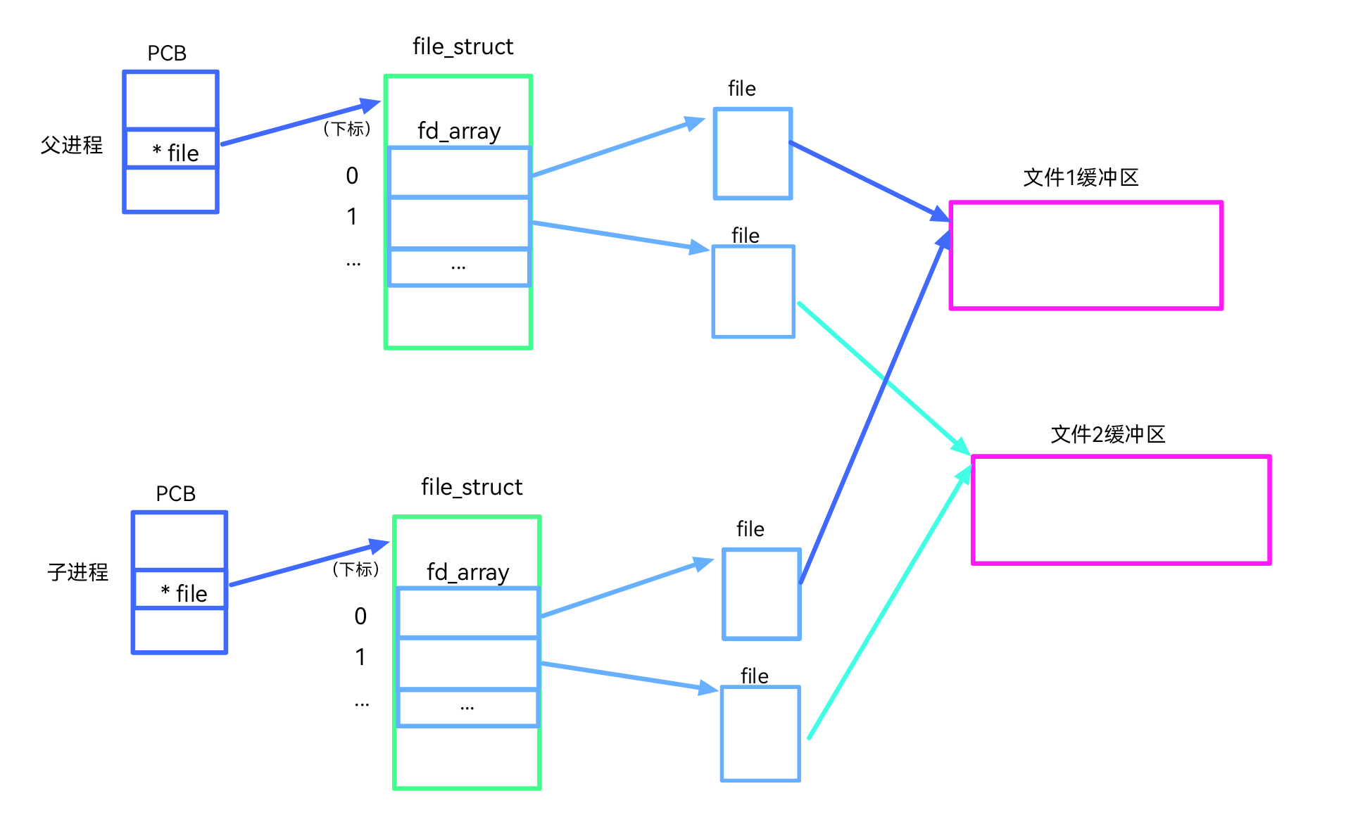 如上图,子进程和父进程的文件描述符表(图中的file_struct,用于管理进程打开的文件)是相同的,表中的指针指向父进程打开的文件的file结构体,通过它们就能访问这些文件。因此,父子进程可以都看到父进程打开的文件,它们天然具有通信的条件。同理,同一个父进程下的不同子进程之间也具有通信条件。