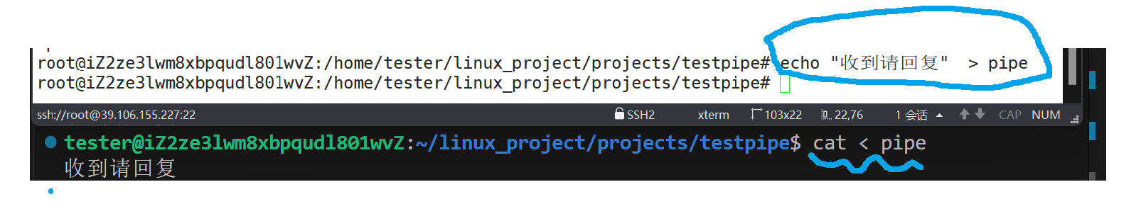 使用命令mkfifo [文件名] 即可在当前路径下创建管道文件。创建完成后,就可以像下图这样通过命令在两个窗口间进行简单的通信。这里用cat读取文件内容时,如果另一边没有输入,则cat对应的进程会阻塞,所以命名管道也有同步机制。事实上,命名管道除了可以在无血缘关系的进程间通信,其它的四个特性与四个通信情况都和匿名管道的相同。