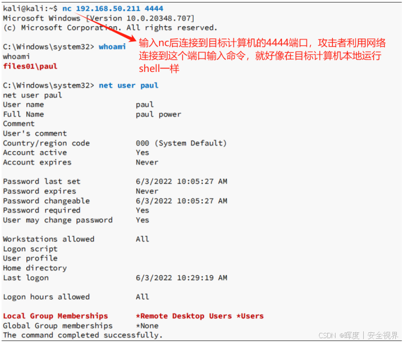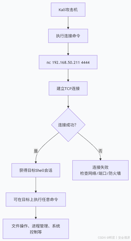 一旦连接建立,攻击者将获得目标主机的完全交互式Shell,可执行:
