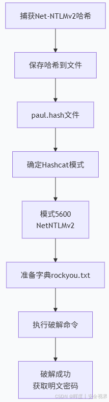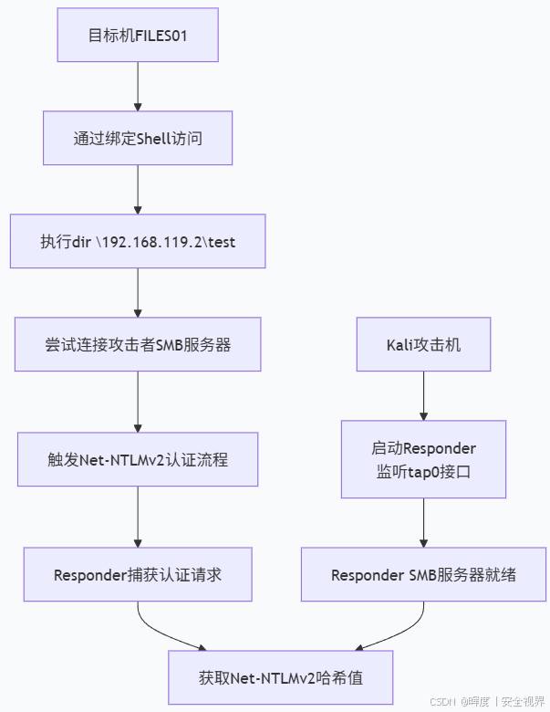 💡 核心要点 :通过诱导目标访问伪冒SMB共享 ,即使共享不存在,Windows仍会完成完整的Net-NTLMv2认证流程,Responder借此捕获包含用户凭证的哈希值,为后续破解奠定基础。