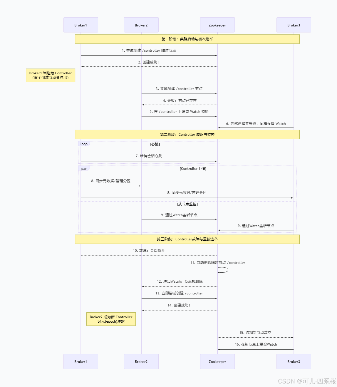 - Controller: Kafka 集群控制器,负责分区 Leader 选举等管理操作。