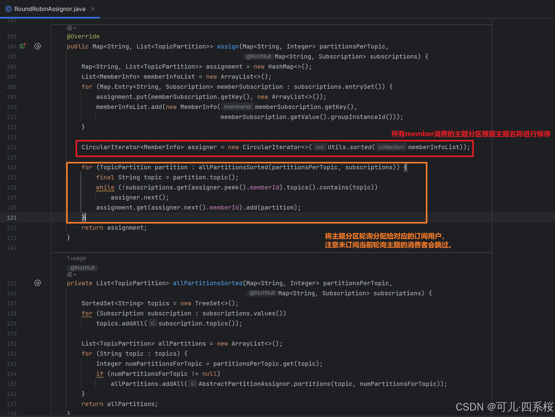- 轮询策略中会将每个消费者按照 memberid 进行排序,所有 member 消费的主题分区根据主题名称进行排序。
