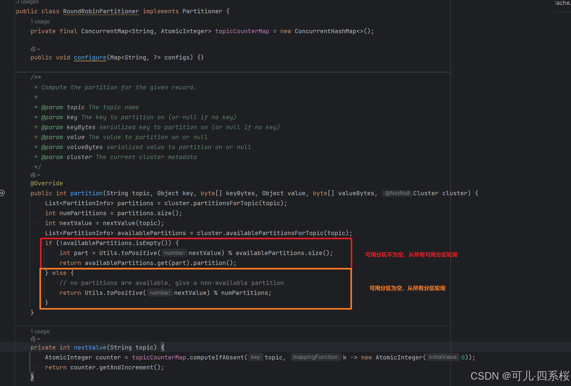 - 前 m 个消费者分配到 n+1 个分区,其余消费者分配到 n 个分区