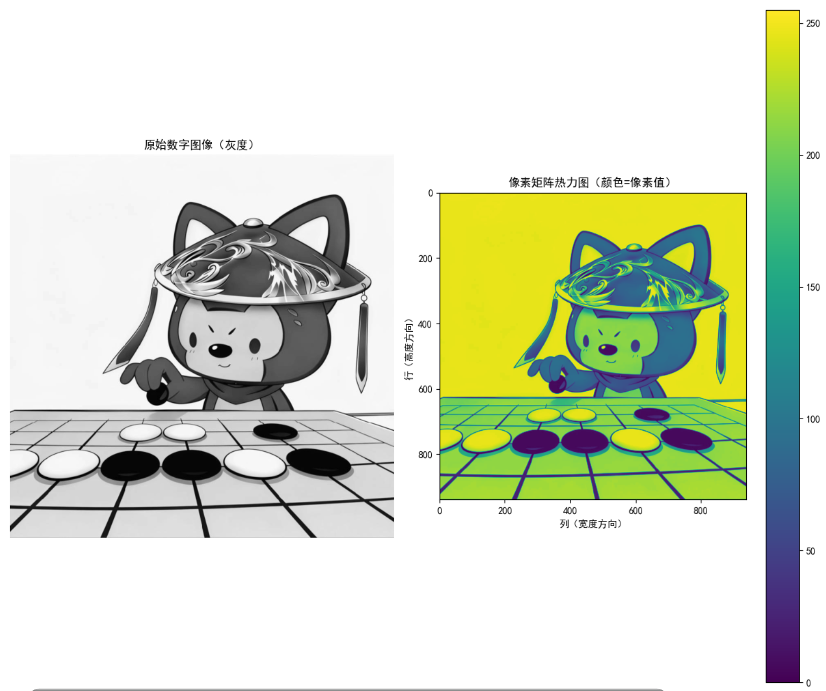 - 可视化窗口会显示两张图:左侧是原始灰度图像,右侧是像素矩阵的热力图(颜色越深 / 越浅对应像素值的大小);