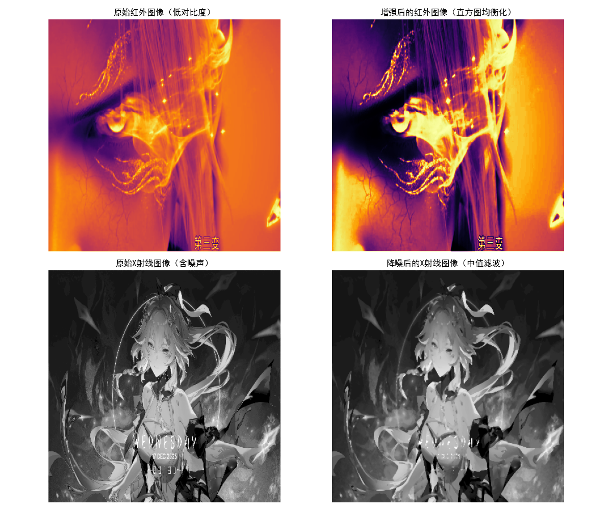 下面的代码模拟 "红外图像增强" 和 "X 射线图像降噪" 两个典型场景,展示数字图像处理在不同波段的应用,包含效果对比图。